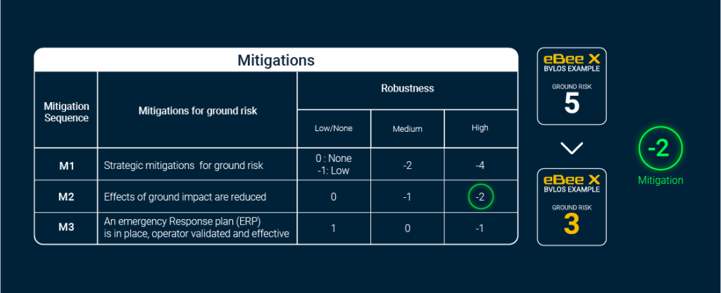 Example: Going back to our initial Ground Risk of 5, with M2 mitigation, you could reach a Ground Risk as low as 3 for BVLOS operations over a populated area.
