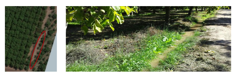 Tras cartografiar la zona, visualizaron la capa del mapa de clorofila. Esta capa indica el nivel de contenido de clorofila en las hojas de los árboles, que suele ser una indicación directa de la salud y el nivel de estrés del cultivo. En este caso, el mapa de clorofila puso de manifiesto una variabilidad significativa en el campo, atribuida principalmente a un contenido excesivo de sal en el suelo en zonas específicas del huerto. Además, un grupo de árboles cerca de la esquina sureste del campo presentaba un estado de salud especialmente bajo. La exploración de esta zona confirmó la presencia no sólo de suelos de alta salinidad, sino también de marcas de enfermedad consistentes con la infección por PT.