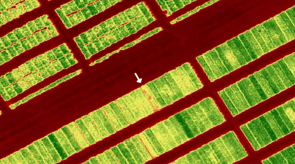 A falta de tratamento fungicida em alguns grupos levou a infecções graves de oídio. As plantas infectadas apresentavam manchas brancas semelhantes a pó. Utilizando o RedEdge-MX, a equipa pôde identificar em massa os pontos focais de infeção e ver quais as parcelas que continham espécies susceptíveis. O mapa de clorofila abaixo mostra os resistentes (verde) e os susceptíveis à doença (amarelo ou vermelho) (Figura 2).