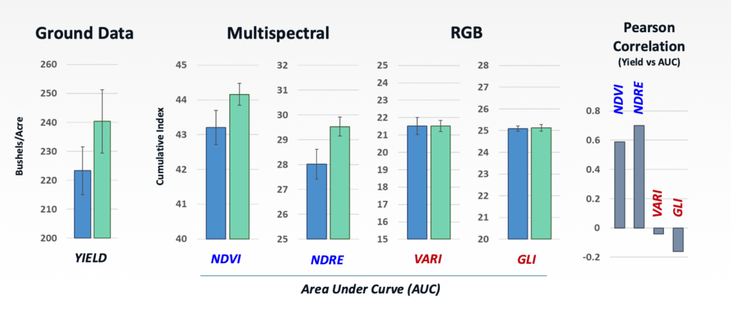 Ultimately, yield is the key metric for a farmer’s bottom line. Impressively, aerialPLOT’s methods for extracting data from calibrated growth curves accurately reflect the final yield outcome in research trials. The nitrogen study results shown in the panel below demonstrate that NDRE and NDVI have a high correlation with yield data from the combine. “Key metrics from our growth curve analysis engine consistently track with yield. What is even more exciting is that we can separate temporal effects on the plant biology that contribute to the final outcome, so we can start to better understand how product applications affect the bottom line,” says Roeth.
