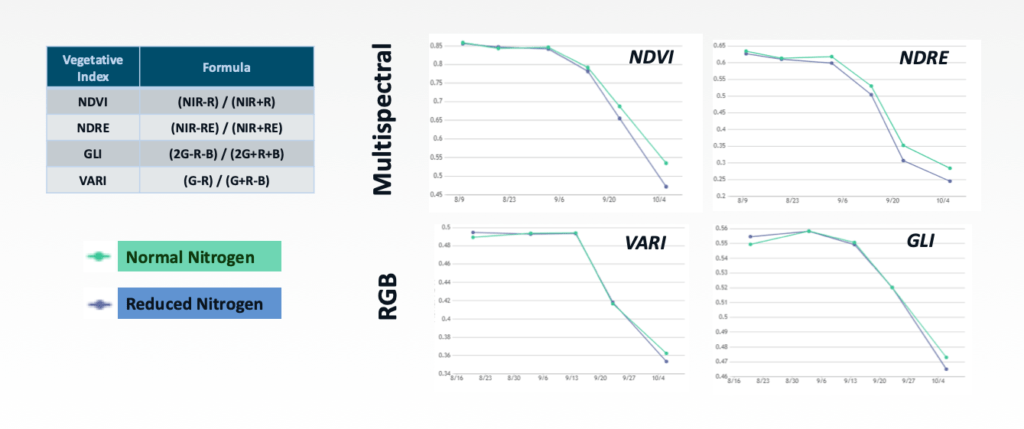 Beyond looking at the spatial image outputs, image analytics using the aerialPLOT software demonstrates the differences in senescence profiles of the crop in response to different nitrogen levels The top panels show the graphs representing values from common vegetative indices derived from the RedEdge-MX (NDVI and NDRE) and the bottom panels show values from RGB-derived indices (VARI and GLI). Where the lines diverge is where a difference is captured between the reduced nitrogen treatment and the normal nitrogen treatment. Again, calibrated multispectral data accurately captures the impact of nitrogen deficiency whereas RGB does not.