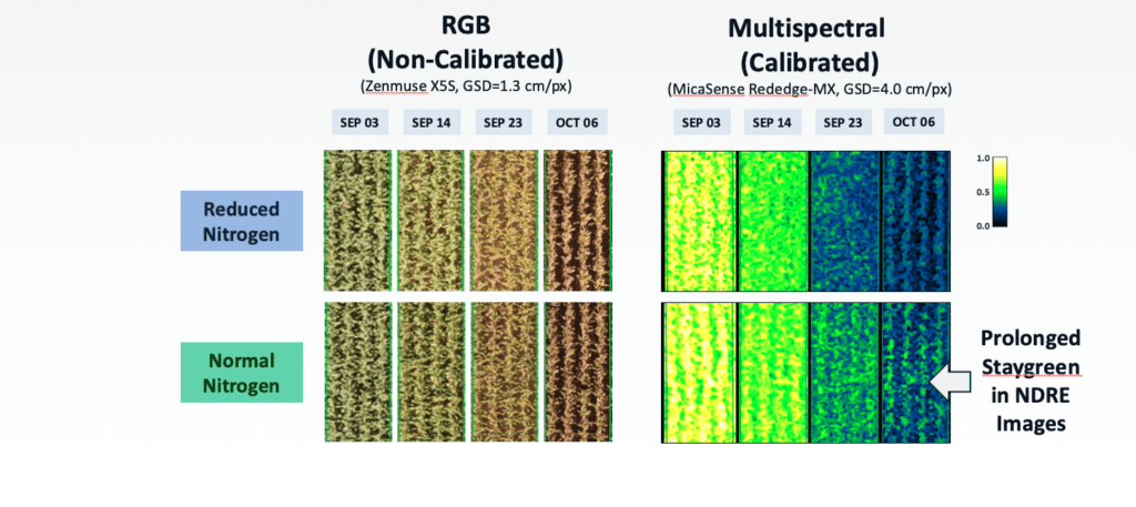 The example below shows a proof-of-concept test of two different nitrogen treatments on corn test plots in 2020 conducted by aerialPLOT. On the left, RGB data from a late season time series was captured from both a reduced nitrogen treatment and a normal nitrogen treatment. By eye, it is very difficult to detect a difference between nitrogen treatments over the course of the season using the RGB images. On the other hand, radiometrically calibrated multispectral data from the RedEdge-MX clearly shows an increased persistence in greenness in corn that received the full nitrogen rate through the end of the season.