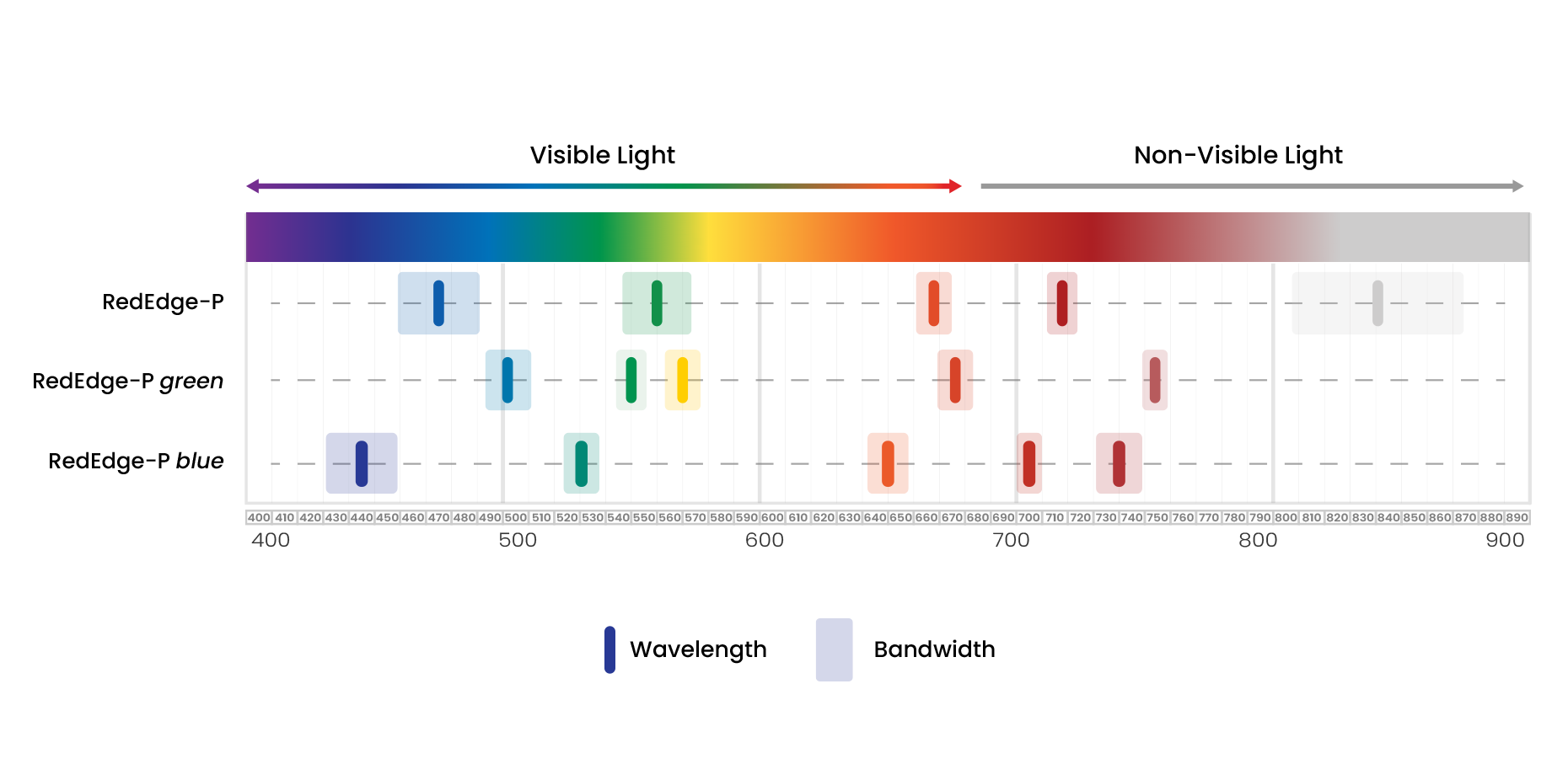 RedEdge-P captures a critical part of the light spectrum for studying plants (712–722 nm), called the red edge band. It is in this section of the spectrum that the first signs of stress start to show. Using analytics generated with the red edge band, it is possible to identify disease sooner and act faster to stop the spread.